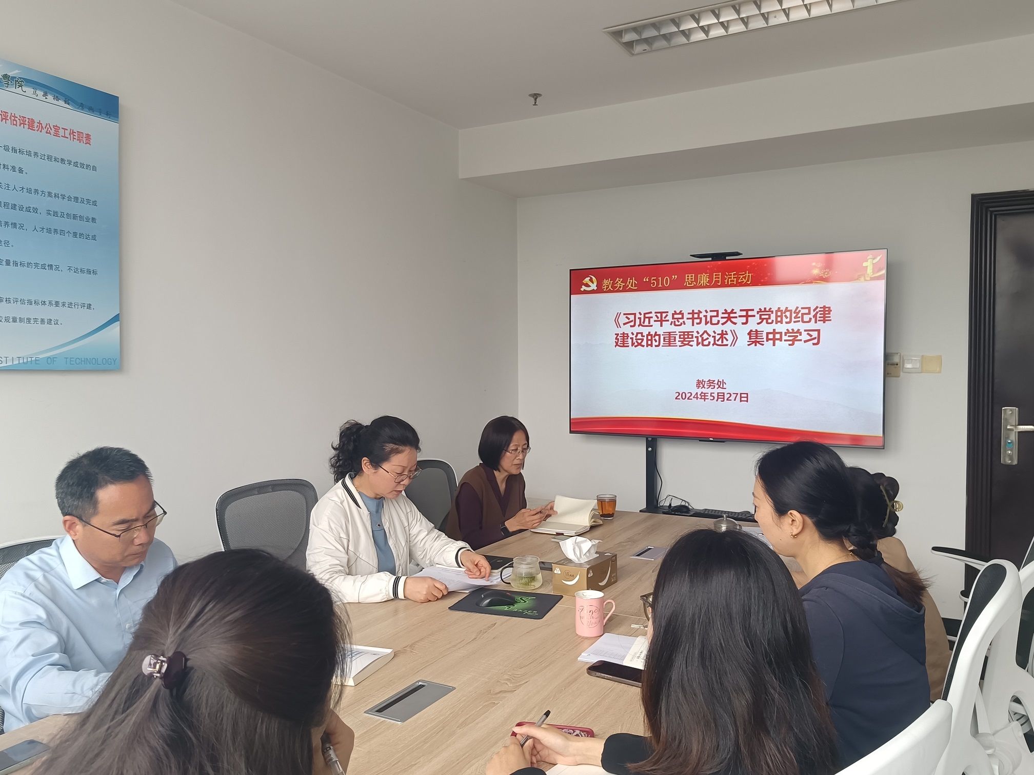 为进一步贯彻落实党的二十大、二十届二中全会以及中央纪委和省纪委、市纪委全会精神,扎实推进党纪学习教育,营造风清气正、健康向上的校园文化环境,引导党员干部自觉养成廉洁奉公、自律自强的思想品德和行为习惯,根据学校《关于开展“510”思廉月活动的通知》(盐工纪【2024】9号)文件精神,5月27日,教务处党支部在行政楼323会议室开展以“学条例、明纪法、守底线”为主题的“510”思廉月教育活动,会议由党支部书记余晓红同志主持,教务处全体党员参加。
