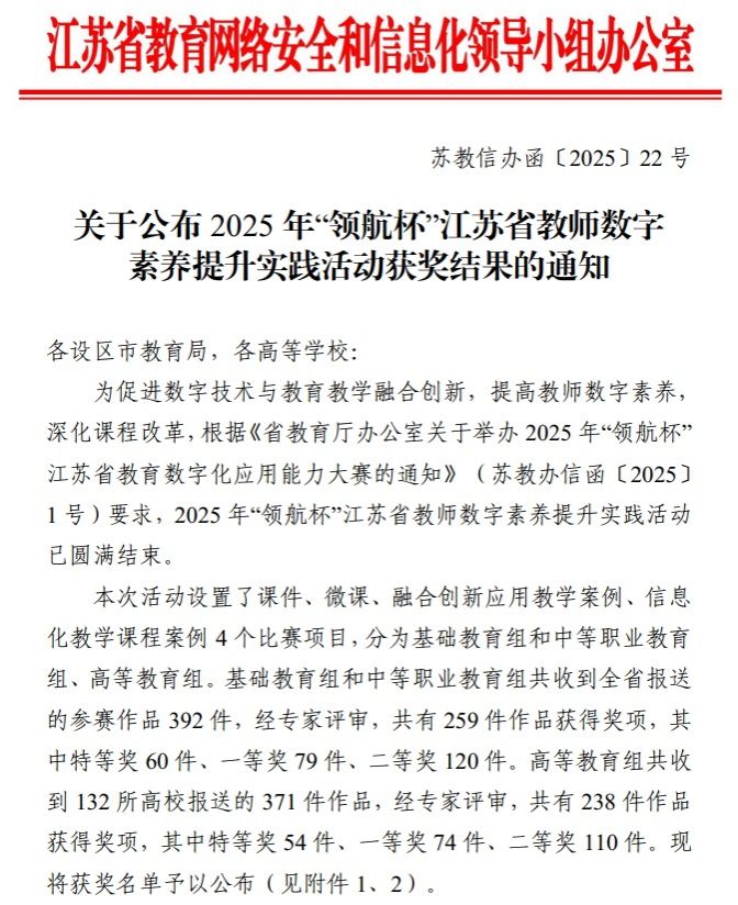 “领航杯”江苏省教育信息化应用能力大赛是由江苏省教育厅主办,江苏省电化教育馆承办的赛事活动,赛项主要包括教师竞赛项目和学生竞赛项目。教师数字素养提升实践活动作为教师竞赛项目,以提升教师信息化教学能力和数字素养为核心目标,聚焦信息技术与教育教学深度融合,为全省教师搭建了交流学习、展示风采、切磋技艺的优质平台,对赋能教育数字化高质量发展具有重要作用。