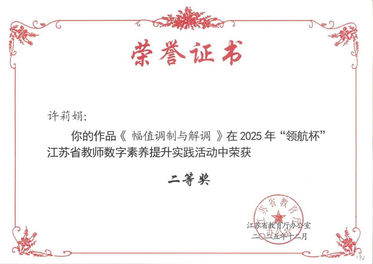 近日,2025年“领航杯”江苏省教师数字素养提升实践活动比赛结果正式公布。我校设计艺术学院李细珍老师、汽车学院许莉娟老师凭借扎实的教学功底、创新的教学设计及娴熟的信息技术应用能力,在众多参赛选手中脱颖而出,分别斩获一等奖、二等奖,充分彰显了我校在教师数字素养培育方面的显著成效。