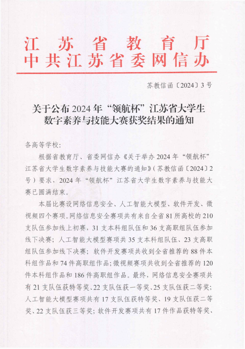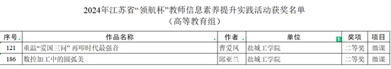 近日,2024年“领航杯”系列比赛结果公布。我校马克思主义学院曹爱凤、机械工程学院邱亚兰两位教师荣获江苏省教师信息素养提升实践活动二等奖。我校学生在江苏省大学生数字素养与技能大赛中共获得特等奖1项,一等奖1项,二等奖4项。