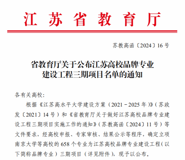 近日,江苏省教育厅发布了《省教育厅关于公布江苏高校品牌专业建设工程三期项目名单的通知》(苏教高函〔2024〕16号),我校机械设计制造及其自动化、化学工程与工艺、电气工程及其自动化、环境设计、材料科学与工程、土木工程、电子信息工程、环境工程、食品科学与工程等9个专业成功获批江苏高校品牌专业建设工程三期项目。