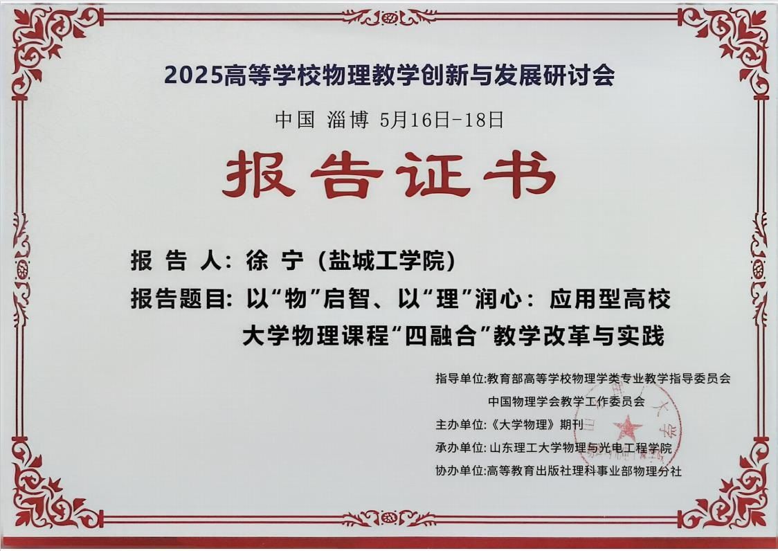5月16-18日,2025高等学校物理教学创新与发展研讨会在山东理工大学召开。在会议中,数理学院徐宁教授作题为《以“物”启智、以“理”润心:应用型高校大学物理课程“四融合”教学改革与实践》的大会报告,系统分享了课程建设与育人实践的创新成果,引发与会专家的热烈讨论与广泛关注。