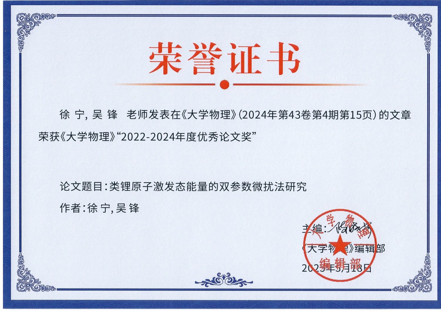 会议期间,经专家委员会评审,遴选出优秀青年编委及2022-2024年度优秀学术论文。徐宁教授凭借突出的学术贡献获评“优秀青年编委”。此外,他与吴锋副教授合作的教研论文《类锂原子激发态能量的双参数微扰法研究》荣获“2022-2024年度优秀学术论文奖”。该研究创新性地提出了双参数微扰计算方法,为原子物理领域的理论探索提供了新思路。