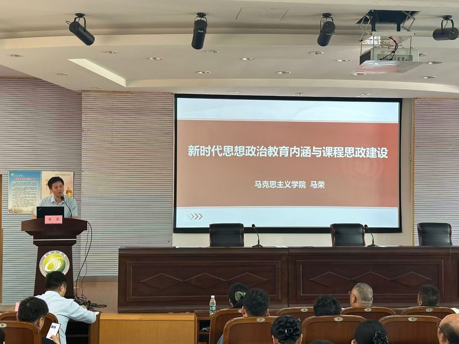 马荣作题为《新时代思想政治教育内涵与课程思政建设》的报告,介绍新时代思想政治教育的内涵,阐述新时代推进课程思政的背景和意义,并为推进课程思政的具体路径提供了建议,说明课程思政建设要处理好科学、人文、思政三者的均衡关系,体现新时代思想政治教育的新要求,以构建全员育人格局的形式推动各类课程与思想政治理论课同向同行,最终形成人才培养的协同效应。