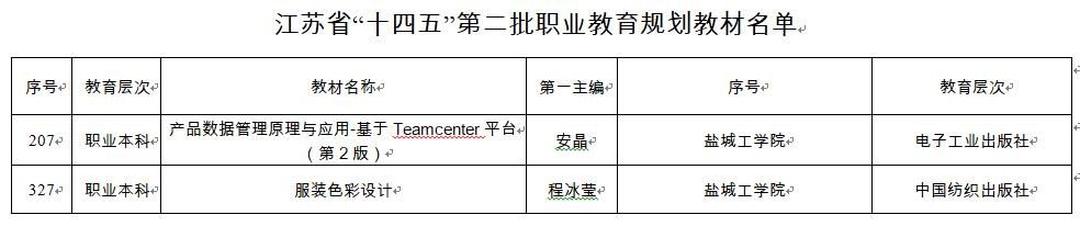 近期,《省教育厅关于公布江苏省“十四五”第二批职业教育规划教材名单的通知》(苏教高函〔2025〕15号)发布,我校《产品数据管理原理与应用-基于Teamcenter平台》和《服装色彩设计》获批“十四五”省级职业本科教育规划教材。