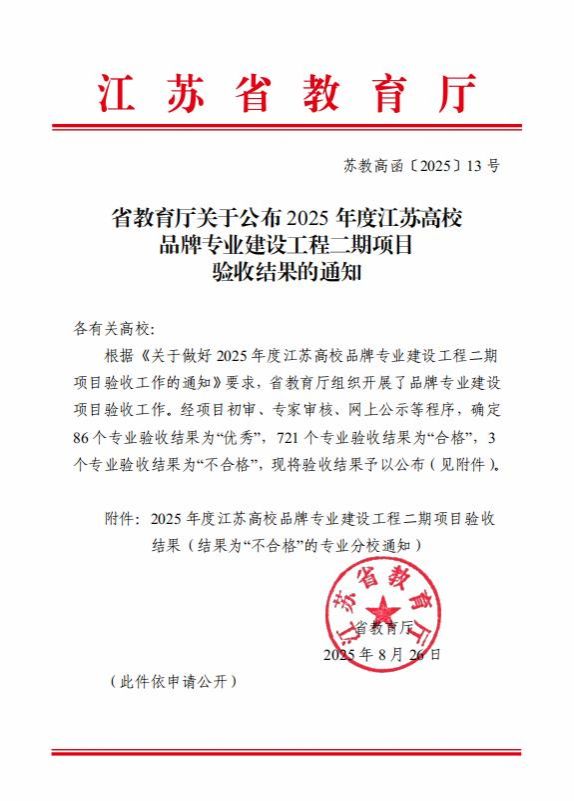 近日,江苏省教育厅正式公布了2025年江苏高校品牌专业建设工程二期项目验收结果,我校17个专业全部顺利通过验收,其中电子信息工程专业在此次验收中获得“优秀”等级。