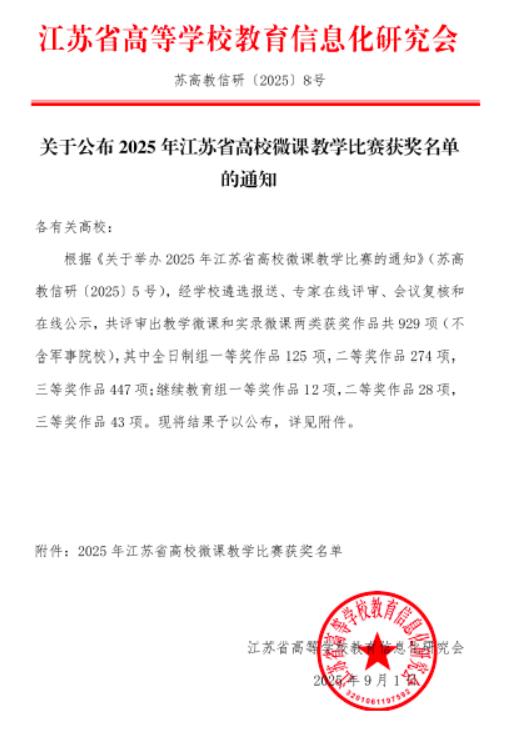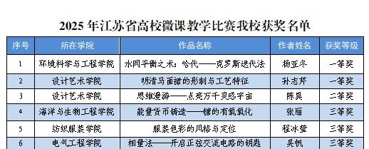 近日,江苏高等学校教育信息化研究会公布了2025年江苏省高校微课教学比赛获奖名单,我校参赛作品表现优异,共有6件作品获奖,其中一等奖2项,二等奖1项,三等奖3项,一等奖获奖数量在同类院校中名列前茅。