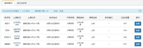 4、 点击查询后,在页面下方出现下图,然后点板块课,接着点操作下方的选课就选中该门课。
