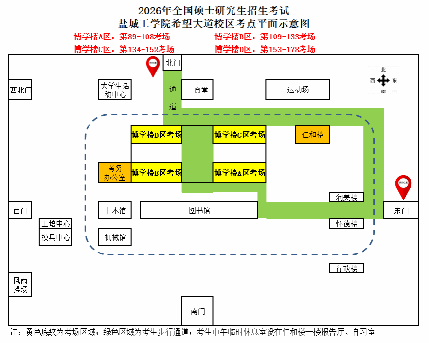 考试地点:盐城工学院希望大道校区(盐城市希望大道中路1号)博学楼A、B、C、D区。
