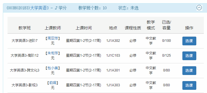 4、 点击查询后,在页面下方出现下图,点操作下方的选课就选中该门课。