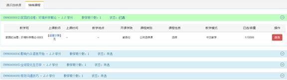 4、 点击下图中的“特殊课程”,然后点击查询后,出现下图,点“选课”就选中该门课。