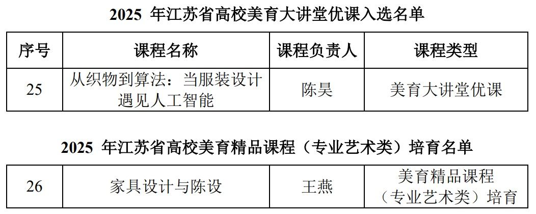 近日,省教育厅正式发布《关于公布2025年江苏省高校美育精品课程培育名单、美育大讲堂优课入选名单及2024年美育精品课程结项验收结果的通知》(苏教办体艺函〔2025〕28号),我校共有2门课程入选,其中美育精品课程(专业艺术类)培育1门、美育大讲堂优课1门。